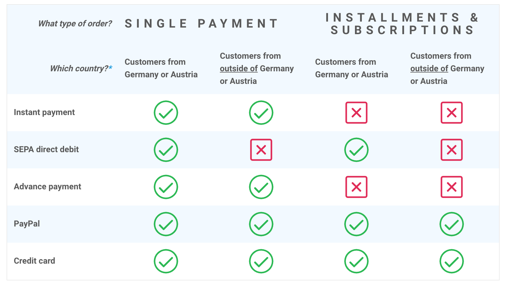 Hay cinco métodos de pago disponibles en Digistore24 para que los clientes puedan pagar por sus productos. Sin embargo, no todos los métodos de pago pueden ser usados siempre, como lo muestra la siguiente tabla: