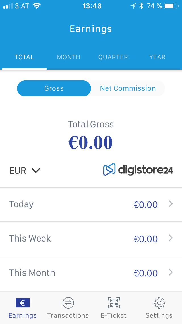 Aquí encontrarás las ganancias que tienes como vendedor de Digistore24. Puedes cambiar los cuatro modos de visualización en la parte superior: