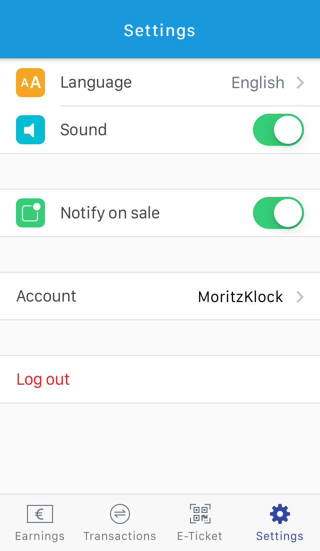 Aquí puedes cambiar el idioma, sonidos de la aplicación y cerrar sesión. Además puedes decidir si quieres o no recibir notificaciones push con detalles de tus ganancias y el sonido “ka-ching” por cada venta realizada.