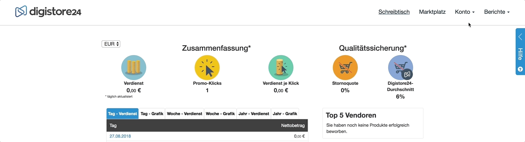 ¡Todas las páginas en esta guía están en la vista del afiliado! Puedes cambiar de la vista del vendedor a la del afiliado en la parte superior izquierda de tu cuenta. Cuando inicias sesión en Digistore24 la primera vez, en automático tendrás la vista del vendedor.